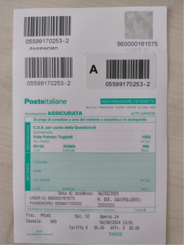 Dopo la compilazione del modulo, la domanda di permesso di soggiorno deve essere spedita per posta tramite un Ufficio Postale, che rilascerà due ricevute principali: