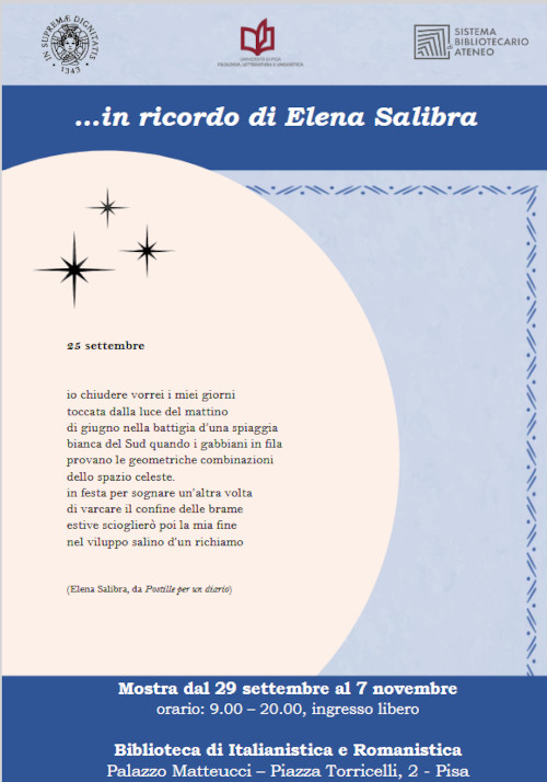 Presso la Biblioteca di Italianistica e romanistica, in occasione della presentazione del libro Postille per un libro [in versi] è stata allestita una mostra una mostra curata dalla dottoressa Cinzia Romagnoli e dedicata all’opera letteraria e critica di Elena Salibra.