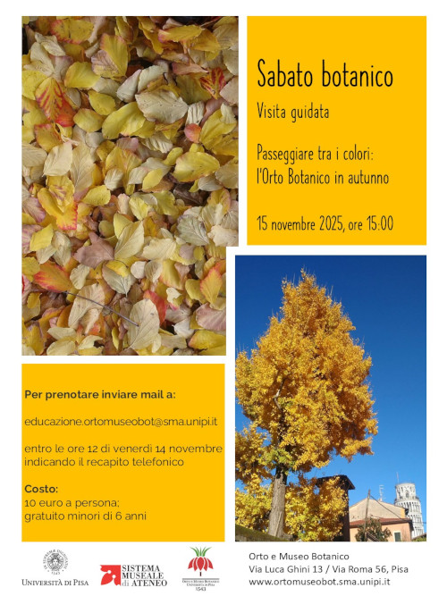 Prenotazione obbligatoria da effettuare entro le ore 12:00 di venerdì 14 novembre scrivendo a: educazione.ortomuseobot@sma.unipi.it. Nella mail è necessario fornire un recapito telefonico. La prenotazione sarà possibile fino a esaurimento dei posti disponibili.