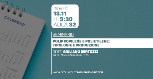 Giovedì 13 novembre, alle ore 9:30, presso l’Aula 32 del Dipartimento di Chimica e Chimica Industriale (Via Giuseppe Moruzzi, 13) il Dott. Giuliano Bertozzi, il Dott. Daniel Toncelli e la Dott.ssa Sara Taddei terranno il seminario dal titolo “Polipropilene e polietilene: tipologie e produzione”.