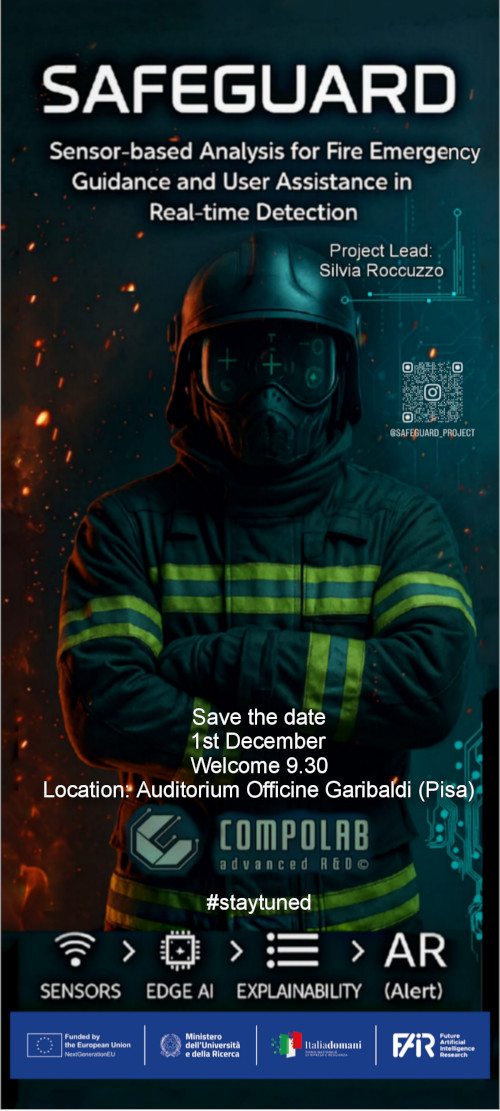 SAFEGUARD (Sensor-based Analysis for Fire Emergency Guidance and User Assistance in Real-time Detection) è un progetto di ricerca e innovazione finanziato nell’ambito del PNRR e del Programma “Future Artificial Intelligence Research-FAIR”. Scopo del progetto è creare un ecosistema di intelligenza artificiale spiegabile (XAI) per assistere in tempo reale i soccorritori, integrando sensori ambientali e fisiologici, algoritmi di edge AI spiegabile, interfacce AR e interfacce vocali in linguaggio naturale per migliorare la consapevolezza situazionale e prevenire rischi per la salute e la sicurezza.